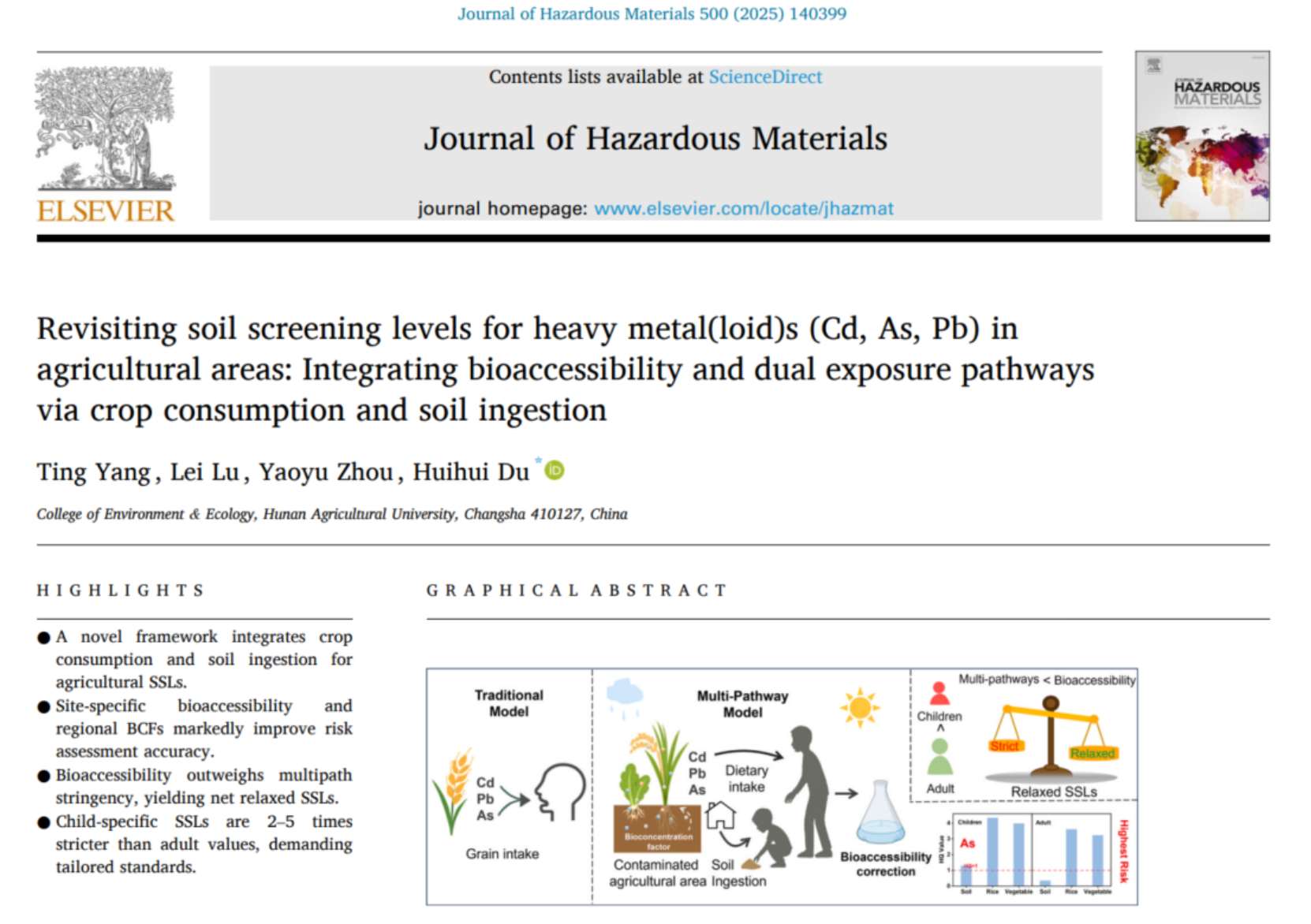 近日,Journal of Hazardous Materials期刊发表了题为“Revisiting soil screening levels for heavy metal(loid)s (Cd, As, Pb) in agricultural areas: Integrating bioaccessibility and dual exposure pathways via crop consumption and soil ingestion”的研究性论文。针对农区土壤Cd、Pb、As污染,该研究构建了土壤-作物-人体多途径暴露模型,创新性地结合区域特异性土壤-作物富集因子(BCF)和重金属体外模拟口服生物可给性校正因子,精准量化了重金属污染对土壤和人类健康的影响。