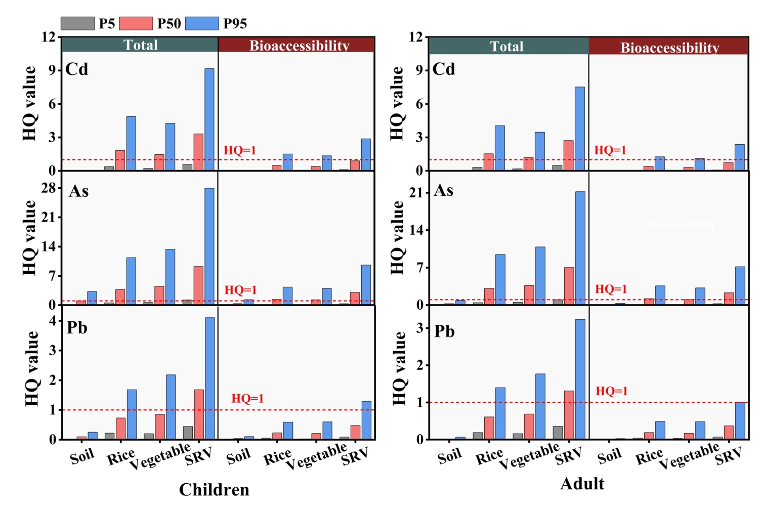 图1 考虑或不考虑生物可及性时,儿童和成人通过食用土壤、蔬菜和大米而暴露的HQ