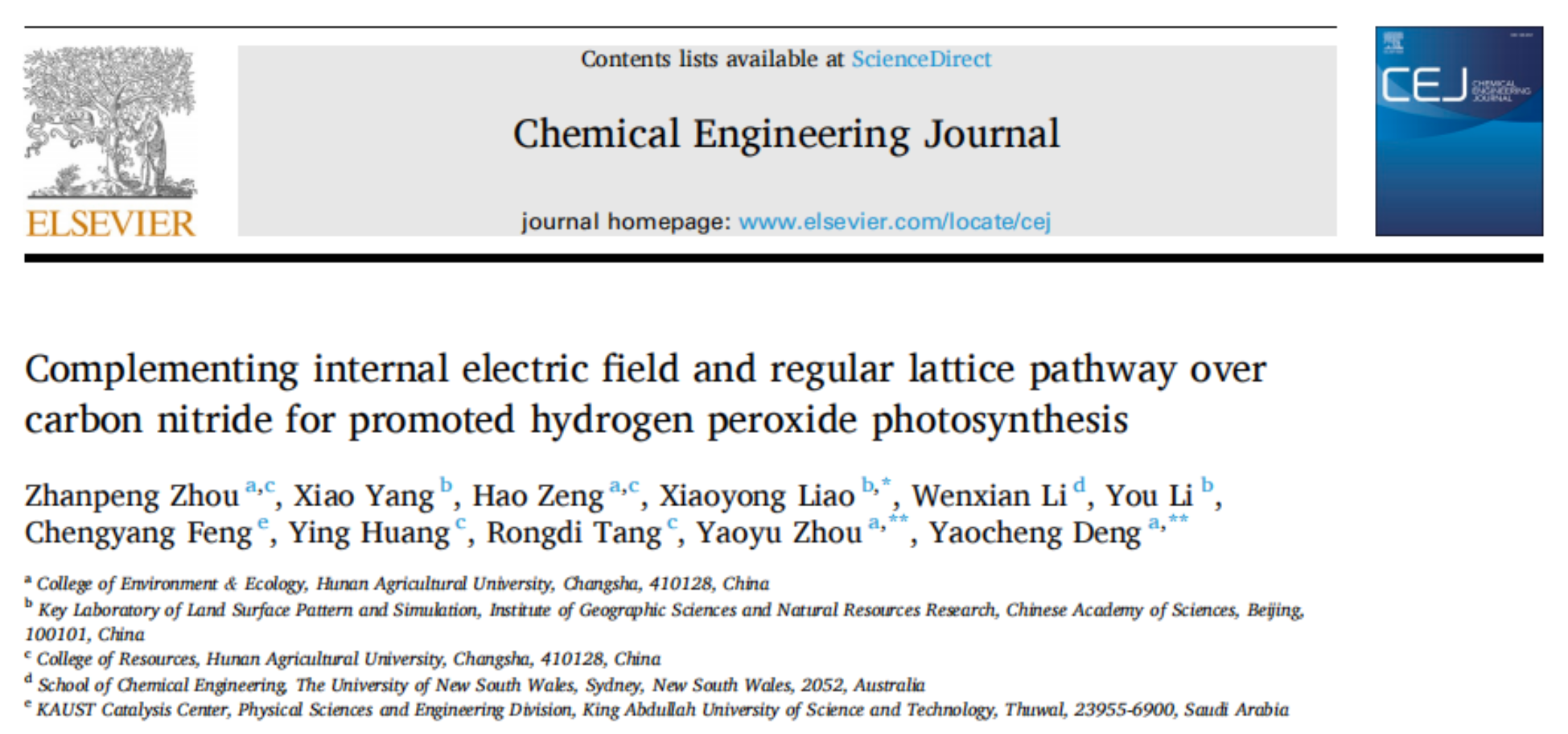 邓垚成团队Chemical Engineering Journal:氮化碳中内部电场和规则晶格通道协同促进过氧化氢光合成