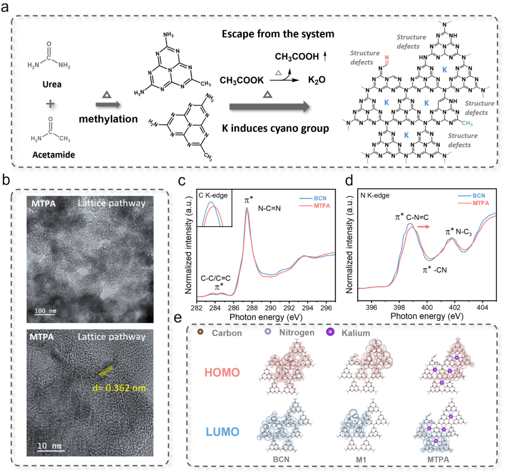 Fig. 1.Determination of regular intramolecular and apparent electron transport channels. (a) Catalyst synthesis and reaction explanation. (b) TEM images of MTPA. (c-d) C K-edge andN K-edge NEXAFS spectra of MTPA and BCN. (e) Electronic configuration of MTPA, BCN, and M1 (comprising cyano and methyl groups while lacking K atoms), as well as the corresponding distribution for both the LUMO and HOMO.