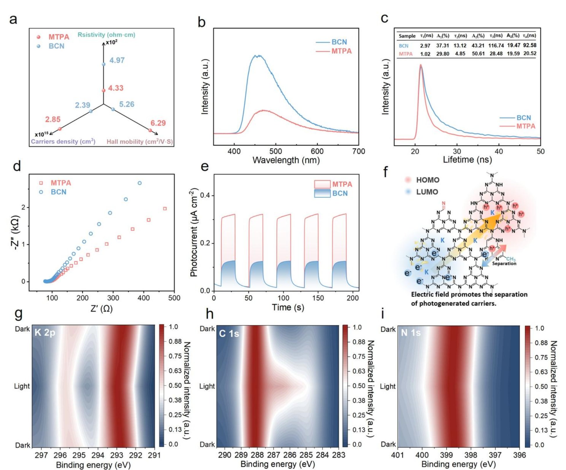 Fig. 2. Investigation into photogenerated carrier transfer. (a) Parameters related to the Hall effect for BCN and MTPA. (b-c) PL and TRPL of BCN and MTPA. d) EIS Nyquist plots of BCN and MTPA. (e) Photocurrent response of BCN and MTPA under visible light irradiation. (f) Illustration of photogenerated carrier transfer, and the yellow arrows represent the direction of the electric field, while the red and blue arrows indicate the separation of photogenerated carriers. (g-i) In-situ XPS spectra of MTPA under dark or visible light irradiation.
