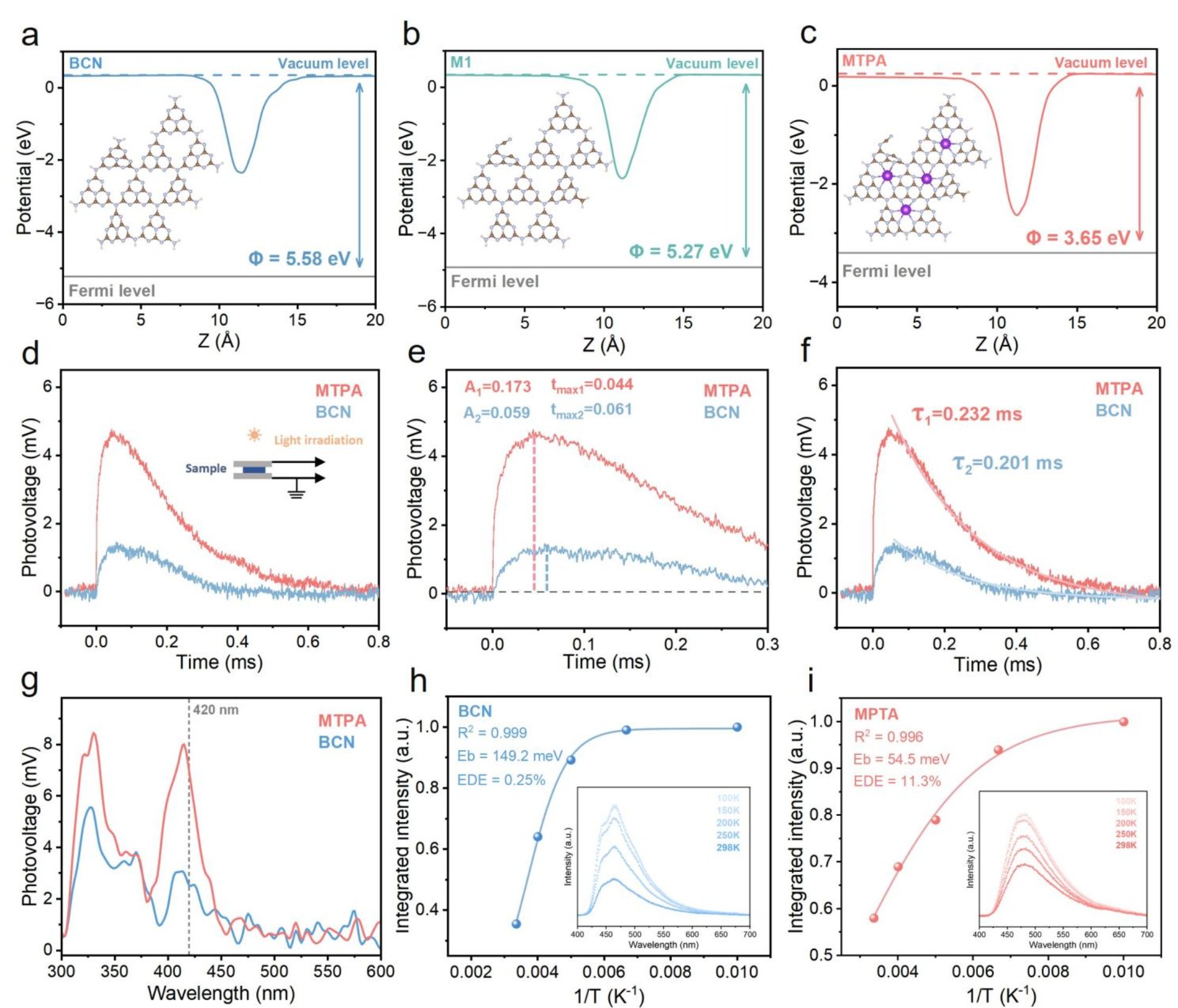 Fig. 3. Analysis of photogenerated carrier transfer and surface charge extraction. a-c) Work function of BCN and MTPA, as well as M1. d) TPV relaxation curves of BCN and MTPA. e) charge extraction rate and efficiency of BCN and MTPA. f) TPV decay curves of BCN and MTPA. g) SPV spectra of BCN and MTAP at different wavelengths. h-i) Fitted curves of temperature and PL intensity, as well as TD-PL spectra (inset) at various temperatures.
