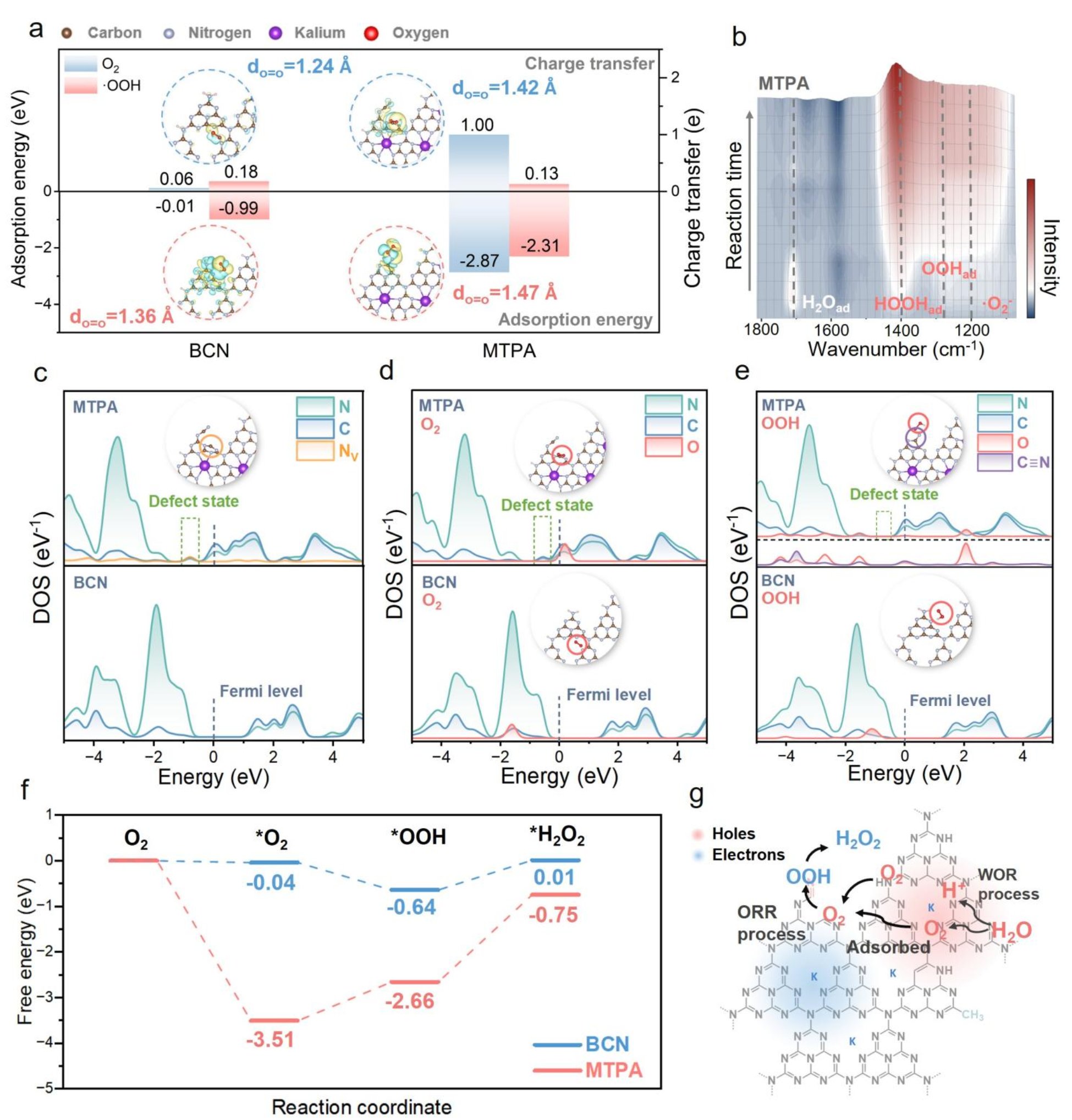 图5通过DFT计算与原位DRIFT光谱,从原子和分子层面深入揭示了MTPA的催化反应机理。DFT计算显示,MTPA对O2及关键中间体(∙O2-, ∙OOH)具有更强的吸附能力和电荷转移,O=O键长变化表明其优异的氧活化能力。吉布斯自由能计算证实了MTPA上两电子ORR路径更有利。原位DRIFT直接检测到了反应过程中∙O2-,和∙OOH中间体的信号,为两电子路径提供了实验证据。态密度分析进一步阐明,钾原子的引入改变了电子结构,形成了缺陷态能级,并分别调控了氮空位和氰基作为O2吸附/活化位点和∙OOH反应位点,实现了氧化还原位点的空间分离与交替反应。最终,该图整合提出了一个完整的H2O2光合成机制模型,完美诠释了结构设计如何协同优化激子解离、电荷分离传输以及氧化还原反应的空间与过程耦合。
