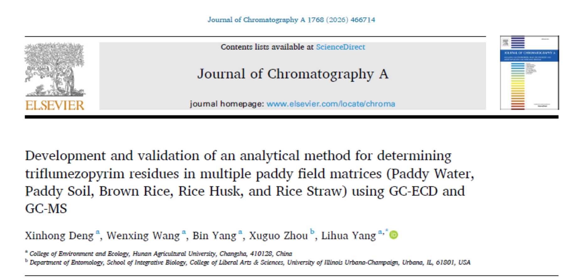 近日,我院23级环境科学与工程专业研究生邓新红同学(第一作者,导师为杨丽华老师)在期刊Journal of Chromatography A上发表了题为“Development and validation of an analytical method for determining triflumezopyrim residues in multiple paddy field matrices (Paddy Water, Paddy Soil, Brown Rice, Rice Husk, and Rice Straw) using GC-ECD and GC-MS”的研究论文。