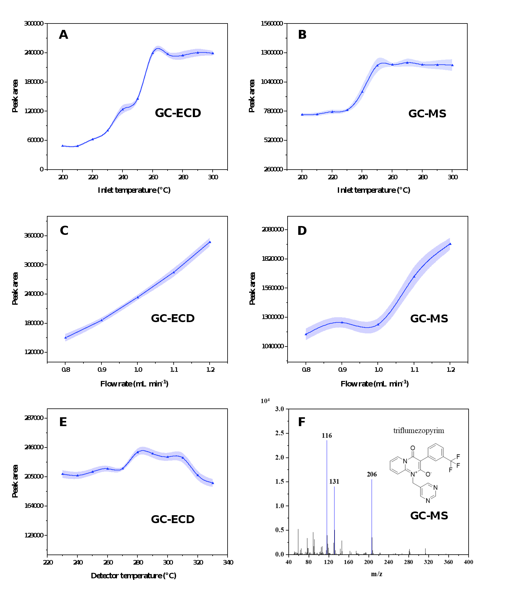 Figure 1.Effect of analytical instrument conditions on the peak area of TFM. Effect of the inlet temperature of (A) GC-ECD and (B) GC-MS on the peak area of TFM. Effect of the flow rate of (C) GC-ECD and (D) GC-MS on the peak area of TFM. (E) Effect of the detector temperature of GC-ECD on the peak area of TFM. (F) Ion full scan chromatogram of 1 mg L-1 standard solution of TFM.
