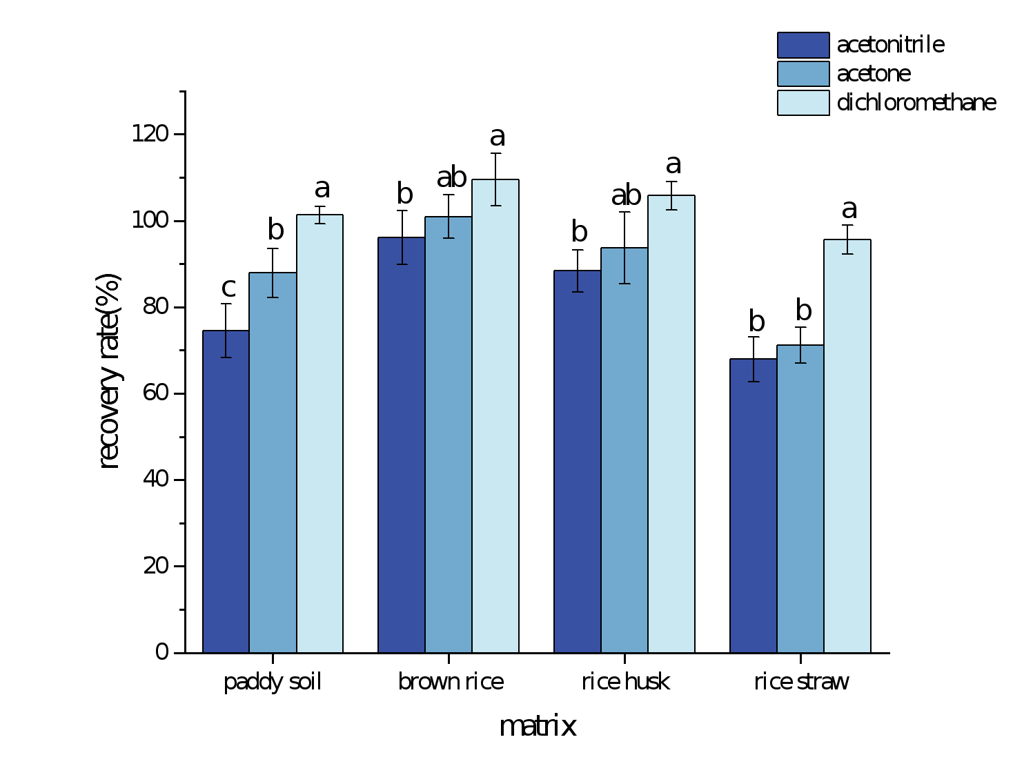 Figure 2. Comparison of the average spiked recoveries when using different extraction solvents.