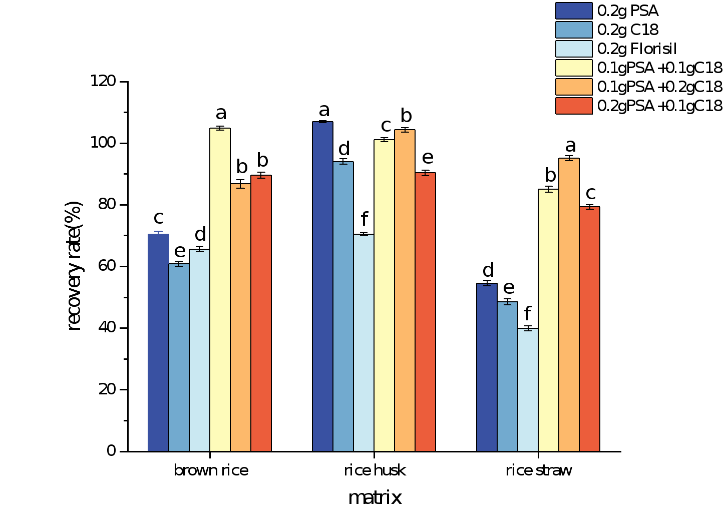 图2和图3系统展示了研究过程中对稻田不同固体样品基质(稻田土壤、糙米、稻壳、稻秆)前处理方法的优化细节,重点通过对比乙腈、丙酮、二氯甲烷三种提取溶剂的提取效率,以及PSA、C18、Florisil三种吸附剂不同组合的净化效果,筛选出最优方案,确保三氟苯嘧啶提取与净化后回收率符合农药残留分析规范,有效消除基质干扰,保障后续检测的准确性。
