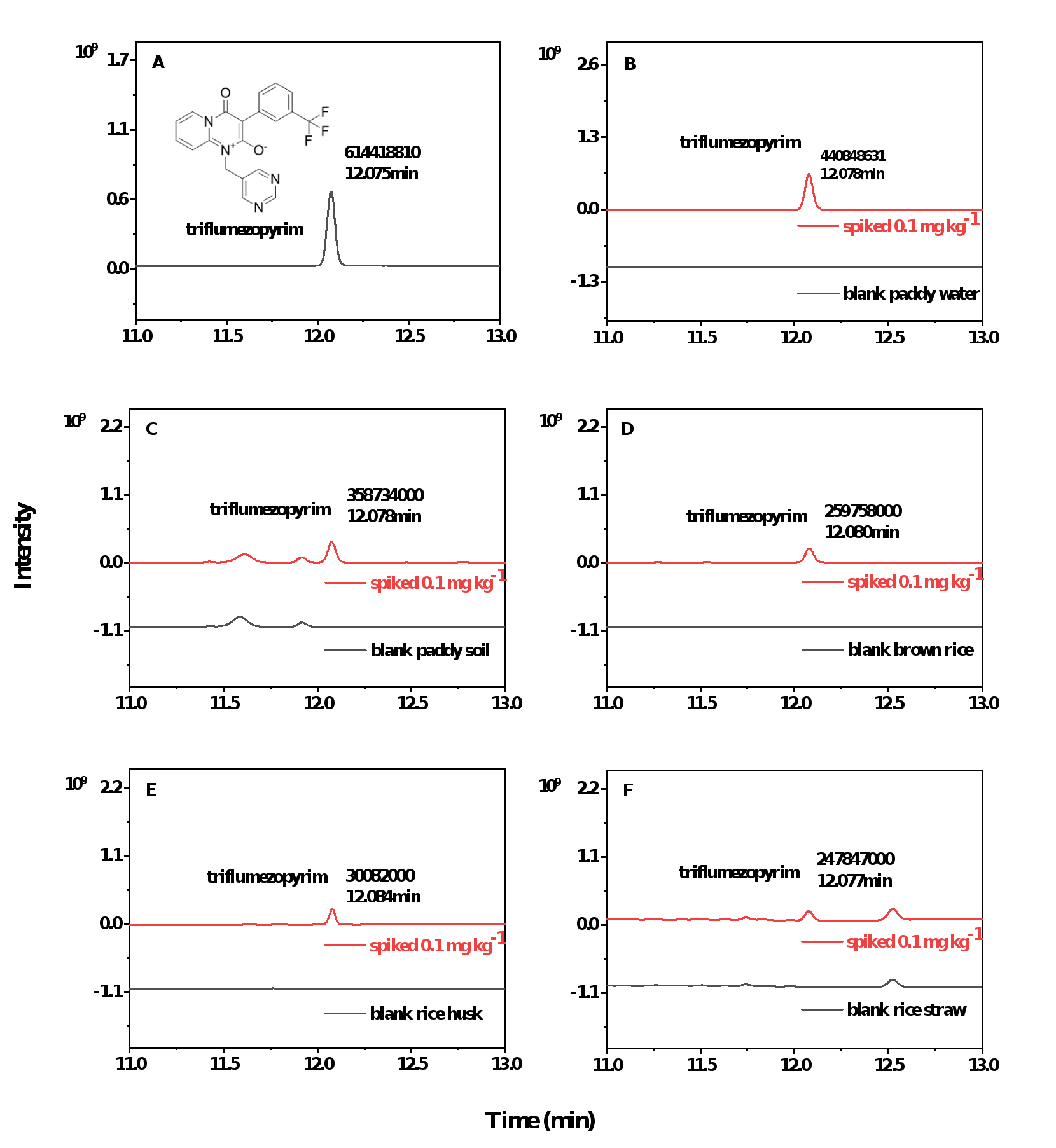 Figure 4. Representative GC-ECD chromatograms: (A) of TFM standard solution (1 mg L-1), (B) of blank and spiked with TFM at 0.1 mg kg-1 paddy water sample, (C) of blank and spiked with TFM at 0.1 mg kg-1 paddy soil sample, (D) of blank and spiked with TFM at 0.1 mg kg-1 brown rice sample, (E) of blank and spiked with TFM at 0.1 mg kg-1 rice husk sample, (F) of blank and spiked with TFM at 0.1 mg kg-1 rice straw sample.