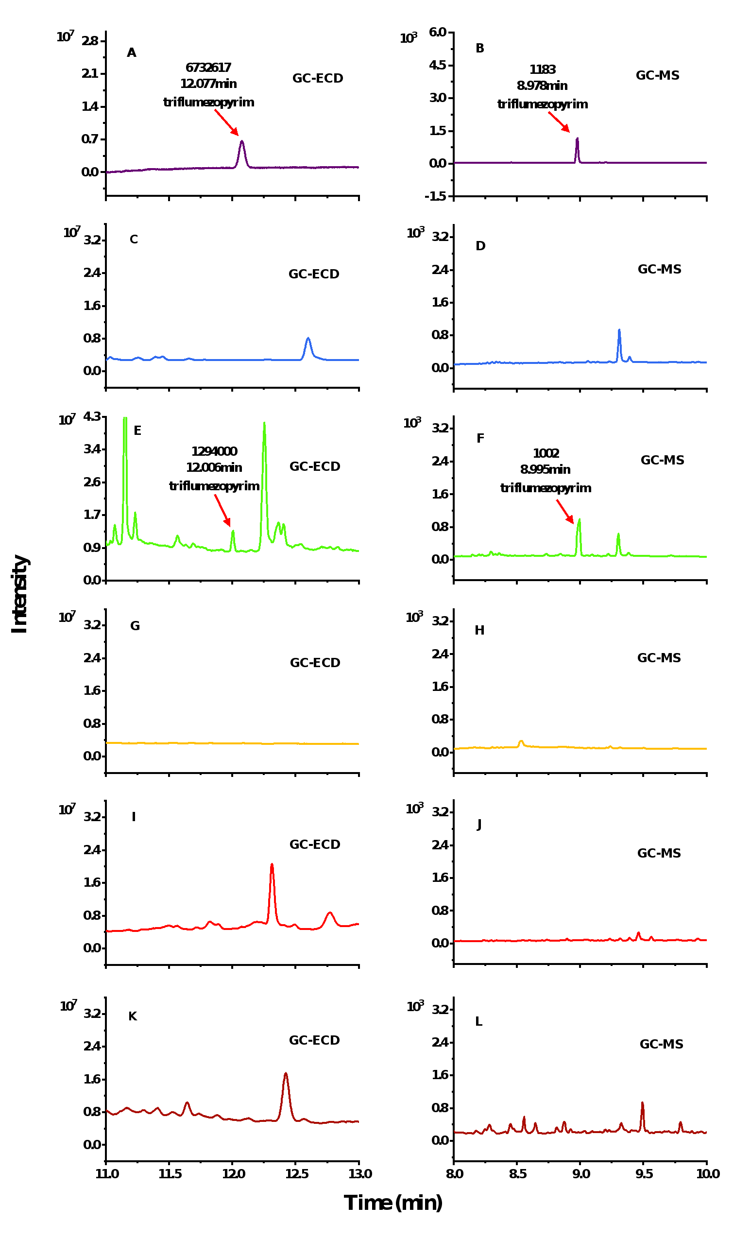 Figure 5. Representative GC-ECD and GC-MS chromatograms of TFM standard solution and real samples in various paddy matrices: (A, B) 0.01 mg L-1 TFM standard solution, (C, D) paddy water, (E, F) paddy soil, (G, H) brown rice, (I, J) rice husk, (K, L) rice straw.