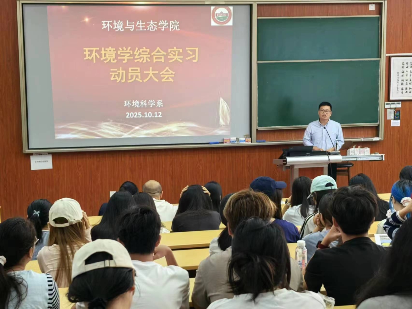 近日,环境与生态学院组织的环境科学专业环境学综合实习在湖南省南岳树木园校外实习基地顺利开展。10月12日,实习动员大会在新T2教室召开,学院副院长雷鸣、党委副书记吴磊、年级辅导员唐亚星、实习指导教师团队及环境科学专业(含国际)155名学生参会,为实习定方向、强保障。