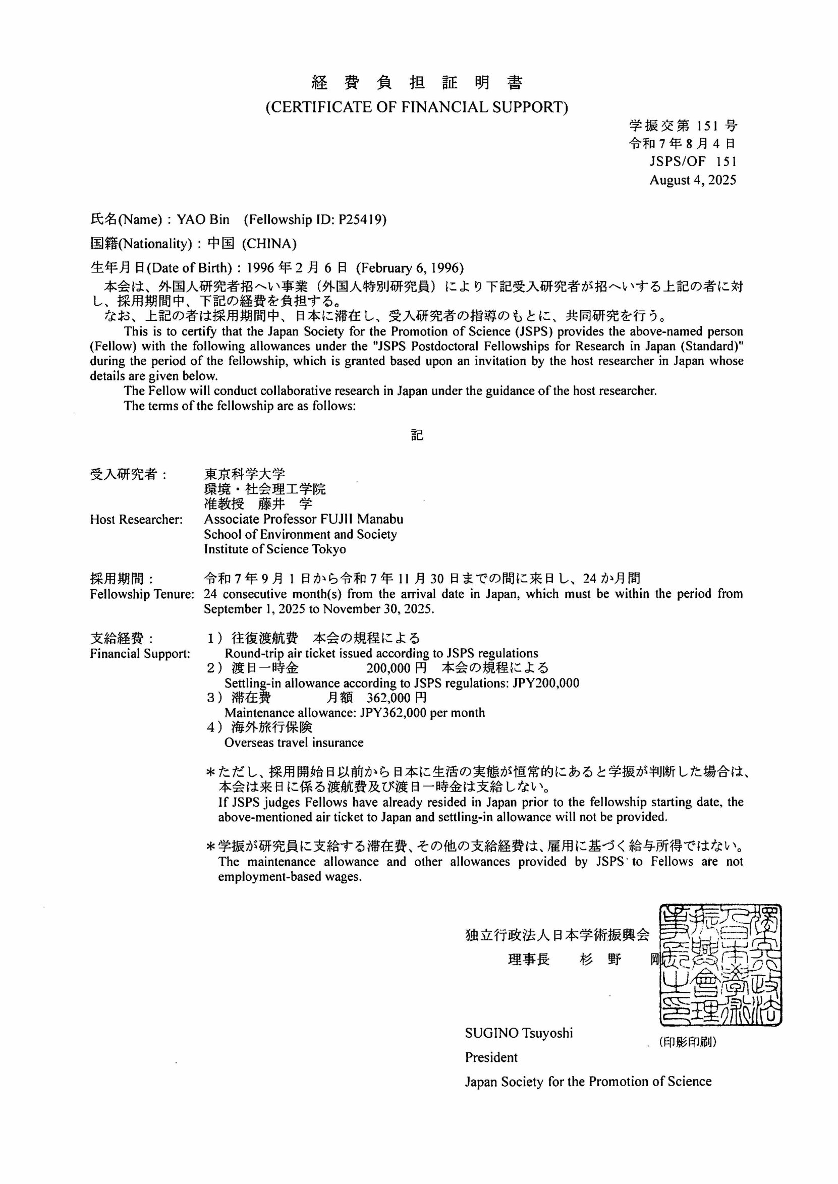 姚斌博士(导师:周耀渝教授/罗琳教授)受日本学术振兴会(JSPS)“外籍特别研究员”项目资助,于2025年11月25日抵达日本东京,开始在东京科学大学(Institute of Science Tokyo,原东京工业大学)的博士后研究工作。