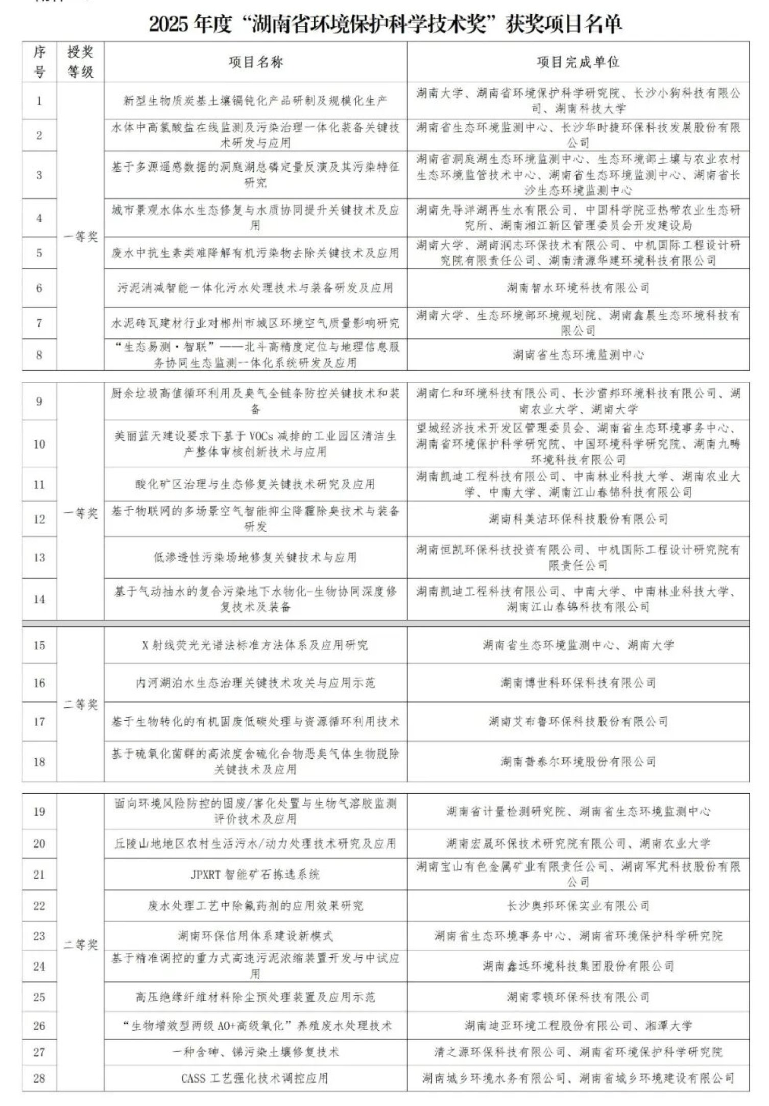 2026年1月12日,2025年度“湖南省环境保护科学技术奖”获奖名单正式公布,由我院深度参与的两项科研成果——“厨余垃圾高值循环利用及臭气全链条防控关键技术和装备”与“酸化矿区治理与生态修复关键技术研究及应用”,从众多优秀成果中脱颖而出,双双荣获一等奖。这不仅是对我院科研实力的高度认可,更是我们深入学习领会习近平生态文明思想,将论文写在祖国大地上,积极服务国家重大战略需求的生动实践。