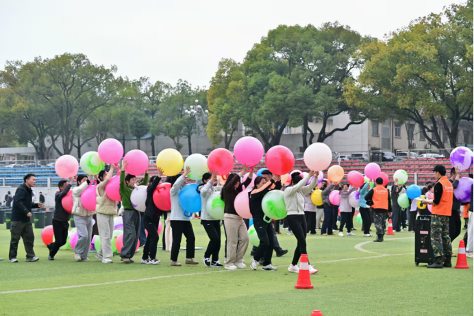以舞团为单位围成圆圈,进行有氧球的抛接接力。这一项目充分考验团队成员之间的默契配合与专注力,学院团队配合流畅,抛接默契,球在空中飞舞的瞬间,传递着团队的信任与协作。