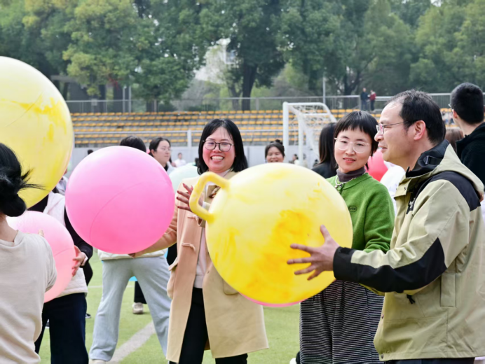 队员们一起用身体夹住有氧球,进行奔跑。学院老师们小心翼翼夹球前进,既要保持速度,又要防止球滑落,充分考验了大家的身体协调性与团队默契。