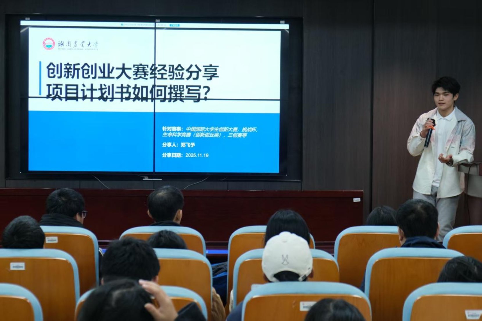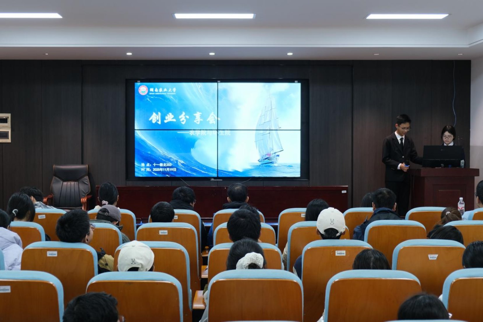 为进一步激发学生创新创业热情,环境与生态学院联合农学院于11月19日在十一教北203举办以“筑梦未来,创享青春”为主题的大学生创业分享会。本次分享会特邀获得中国创新创业大赛铜奖的吴连东团队、湖南省创新创业大赛银奖的郑飞予团队、湖南农业大学创新创业大赛二等奖赵翠银团队作为主讲嘉宾,吸引了众多怀揣着创业梦想的学生参加。