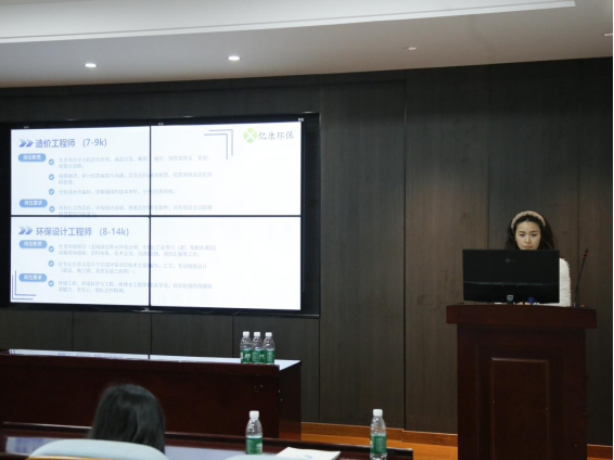 招聘会现场,陶礼通过图文并茂的演示,从发展历程、企业文化、核心业务板块等维度全面介绍公司概况,并针对环境工程、生态科学等专业毕业生,详细解读了技术研发、项目运维、客户服务等岗位的职责要求、晋升路径及薪资福利体系。答疑环节中,HR对同学们关心的实习安排、培训机制、职场适配性等问题逐一细致解答,现场互动氛围热烈。