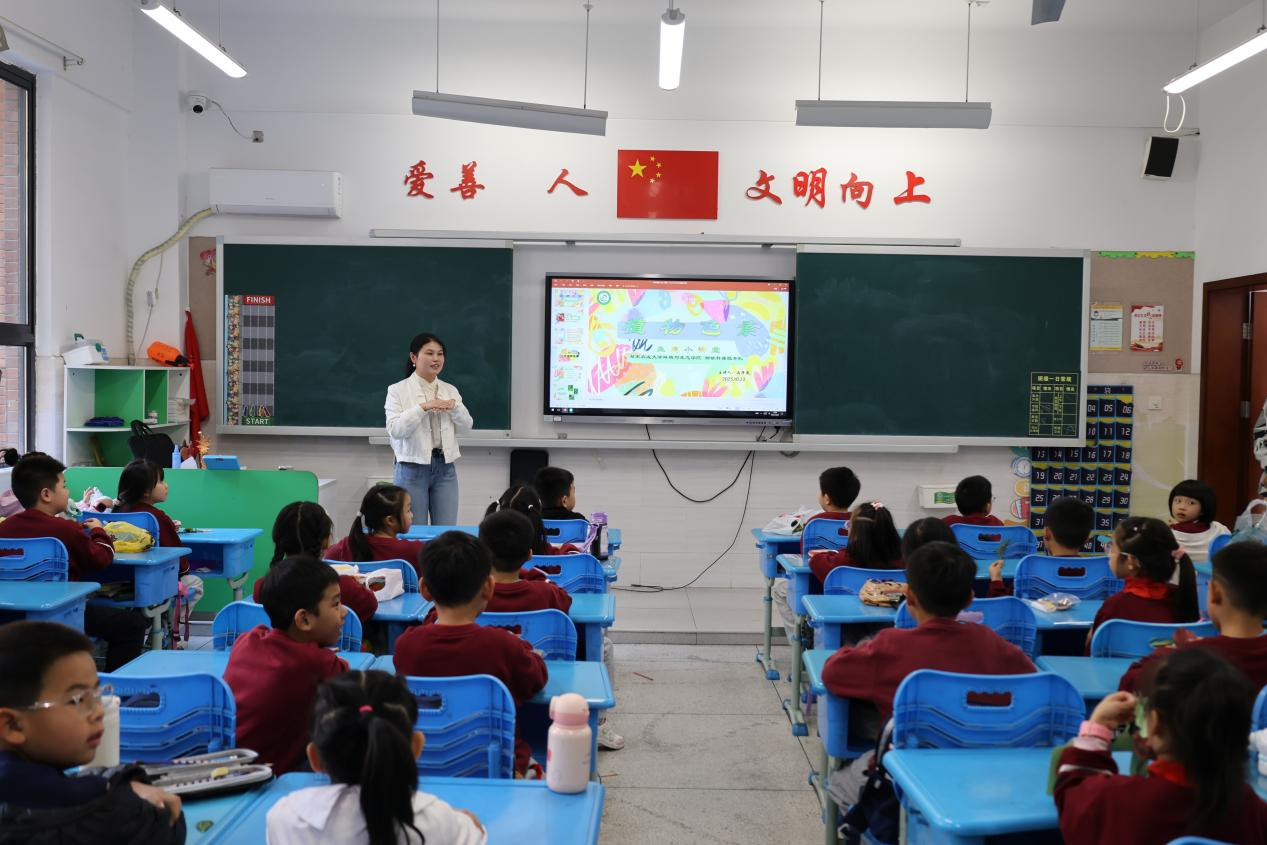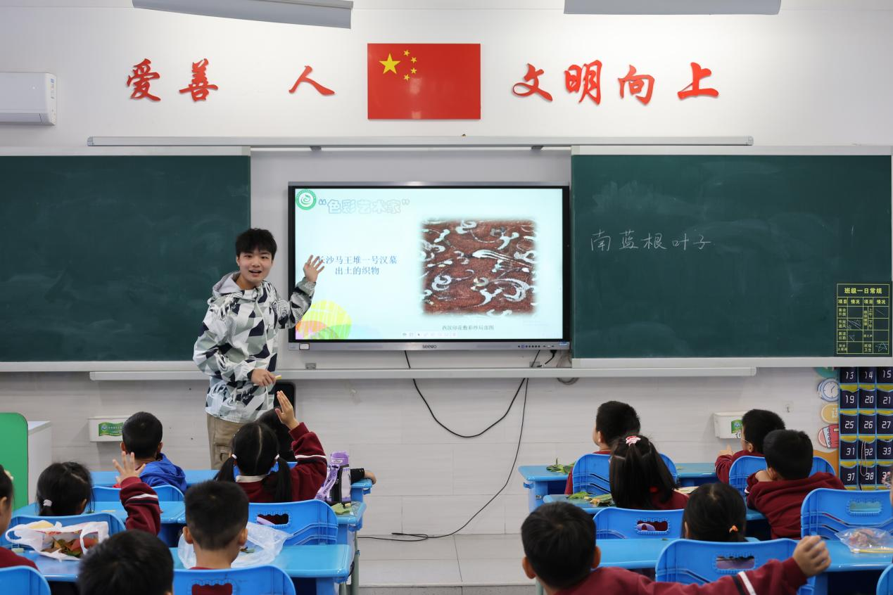 当讲到非物质文化遗产“蓝染工艺”,志愿者展示长沙马王堆汉墓出土织物的图片时,孩子们忍不住凑近屏幕,小声惊叹:“古人好厉害!”“蓝色居然是植物染出来的”。志愿者趁机提问:“大家觉得植物还能染出什么颜色?”“黄色!”“紫色!”抢答声接连不断,课堂氛围热烈又鲜活,孩子们在问答间深化了对自然与人文交融的理解。