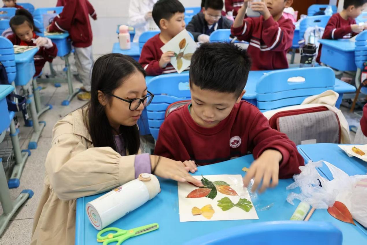 “植物拓染”手工制作环节,孩子们分为4个小组,戴好一次性手套,将精心准备的植物叶片与花瓣平铺在拓染纸上,用胶带固定后,以硬币反复按压。随着汁液缓缓渗出,植物的纹路与色彩逐渐印在纸上,形成独一无二的自然艺术品。孩子们捧着自己的“自然艺术品”,互相展示、分享技巧,有的还主动帮同伴调整按压力度,指尖残留的草木清香与脸上的笑容相映成趣。