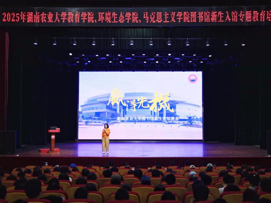 2025年10月14日晚,湖南农业大学环境与生态学院在大礼堂举办新生专题讲座,本次讲座特邀龙凤娇老师和蔡丽娜老师主讲,环生院2025级新生参加活动。讲座以“知识滋养和生命守护”为主题,涵盖图书馆入馆教育与艾滋病预防两大内容。