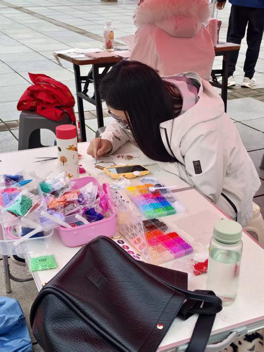 活动伊始,志愿者们便早早到场,签到领取拼豆工具,投入到创作之中。五彩斑斓的拼豆在指尖排列组合,化作一个个生动可爱的图案——有小动物、有花朵、有爱心,大家在动手实践中感受创意之美,也在协作中体会奉献之乐。正如雷锋精神所倡导的,点滴善举皆可为他人带来温暖。本次活动通过拼豆这一趣味形式,吸引更多人参与爱心义卖,让志愿服务精神在指间传递、在心中生根。