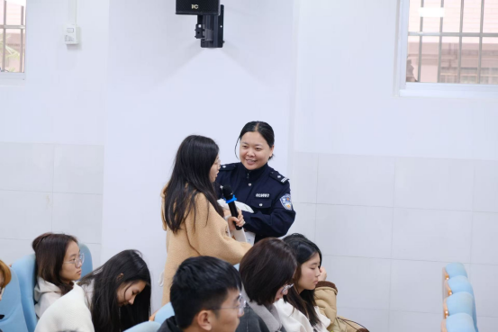 交流互动环节,同学们围绕日常遭遇的诈骗疑点、法律认知困惑等踊跃提问,邹娜警官逐一进行专业、细致、通俗的解答,切实为学生答疑解惑、厘清误区。整场讲座案例典型、剖析深刻、警示有力,有效提升了学生的安全防范意识和识骗防骗能力。